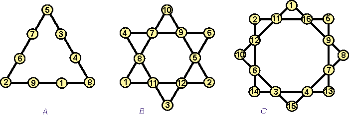 Цифровая фигура называется магической, если составляющие ее числа не повторяются и дают при определенных сочетаниях (чаще всего рассматривается сумма вершин и / или сторон) заранее задуманный составителем результат. Например, чтобы показать что фигура Триады (треугольник) помимо тройственности, может отвечать и за двоичность, шестеричность и двенадцатиричность Мироздания, цифры на ней располагают следующим образом (А):